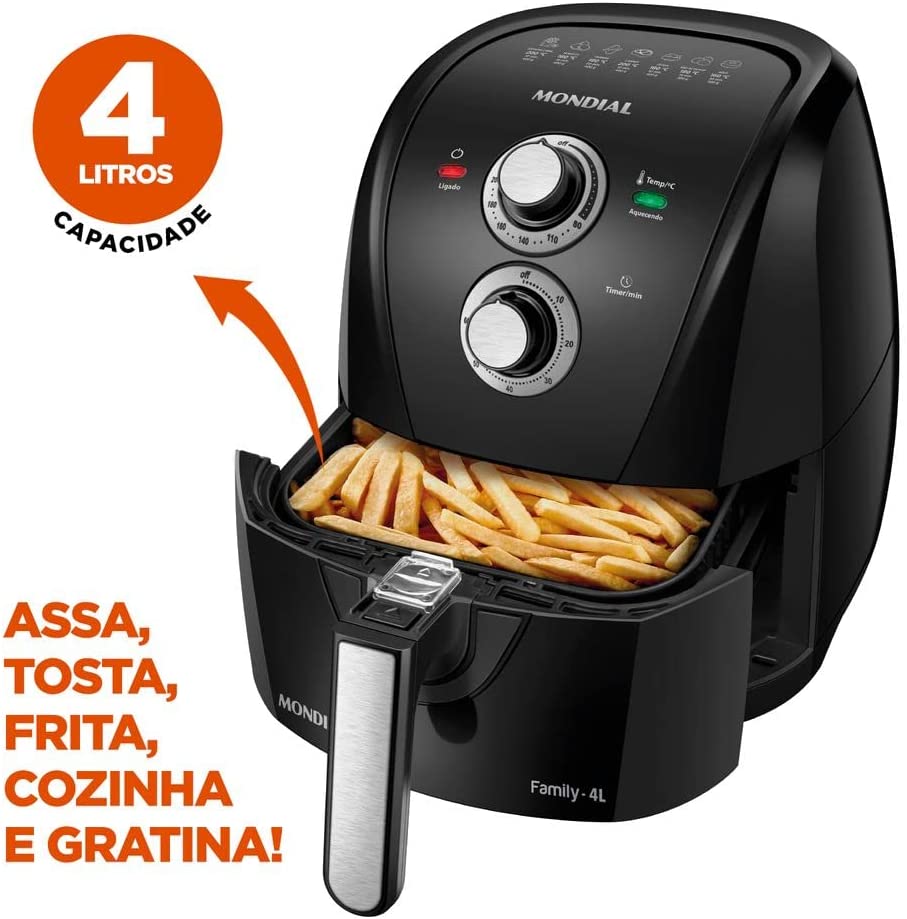 A fritadeira tem capacidade para 4 litros, e é ideal para o preparo das mais diversas receitas para toda família. Ela tem potência de 1500 W, garantem que seus alimentos fiquem prontos rapidamente e uniformemente, com ajuste de temperatura de até 200 graus Celsius..
