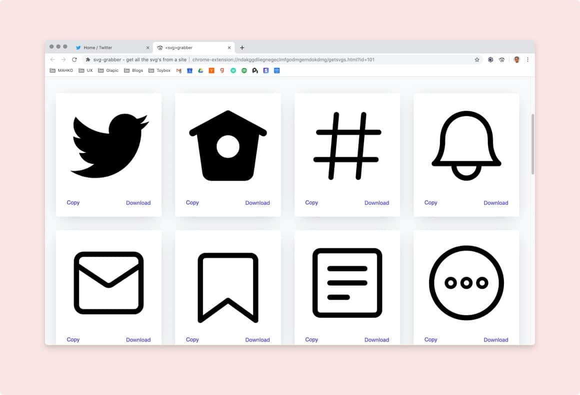 Às vezes, você só precisa capturar um logotipo ou um ícone em uma página. Se for esse o caso, experimente o SVG Grabber. Com apenas um clique, ele puxará automaticamente todos os arquivos SVG da página.