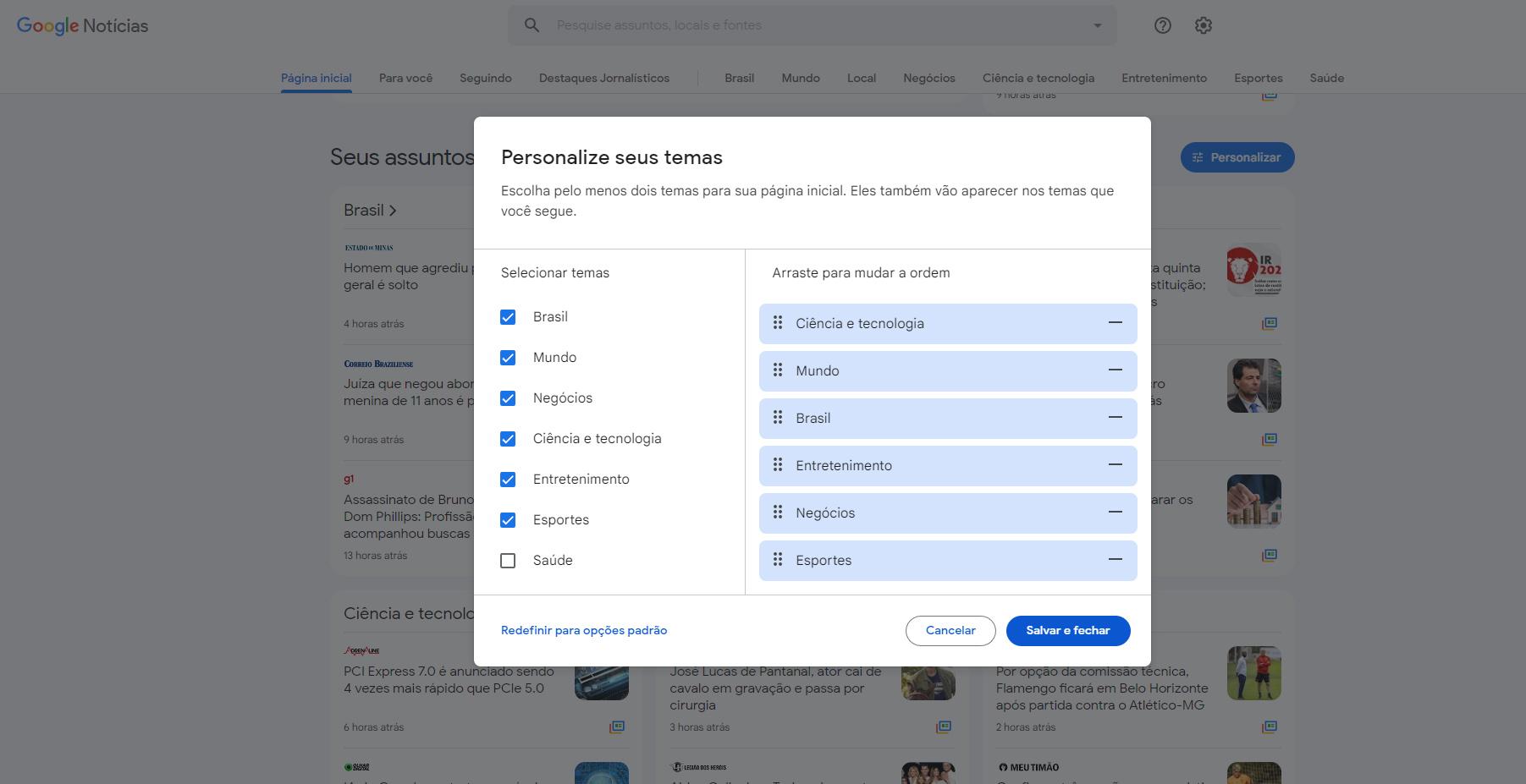 Todavia, ainda na mesma área em que os assuntos estão, há a possibilidade de encontrar o botão intitulado “personalizar”. Com o menu, você poderá adicionar, retirar e até mesmo modificar a ordem das pautas que surgem na página do Google Notícias.