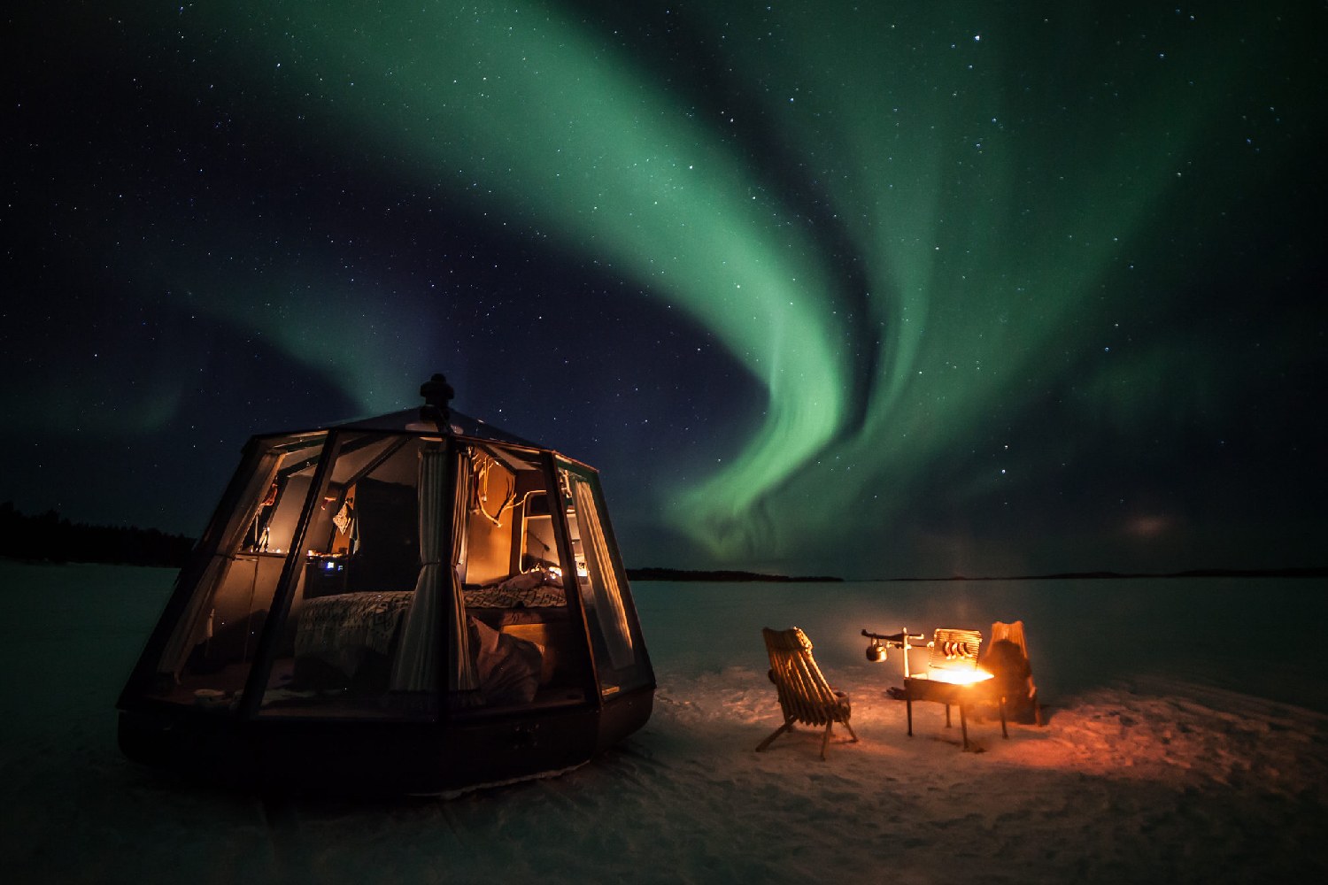 A experiência, gratuita para os sortudos hóspedes, promete momentos mágicos e inesquecíveis no Círculo Polar Ártico.