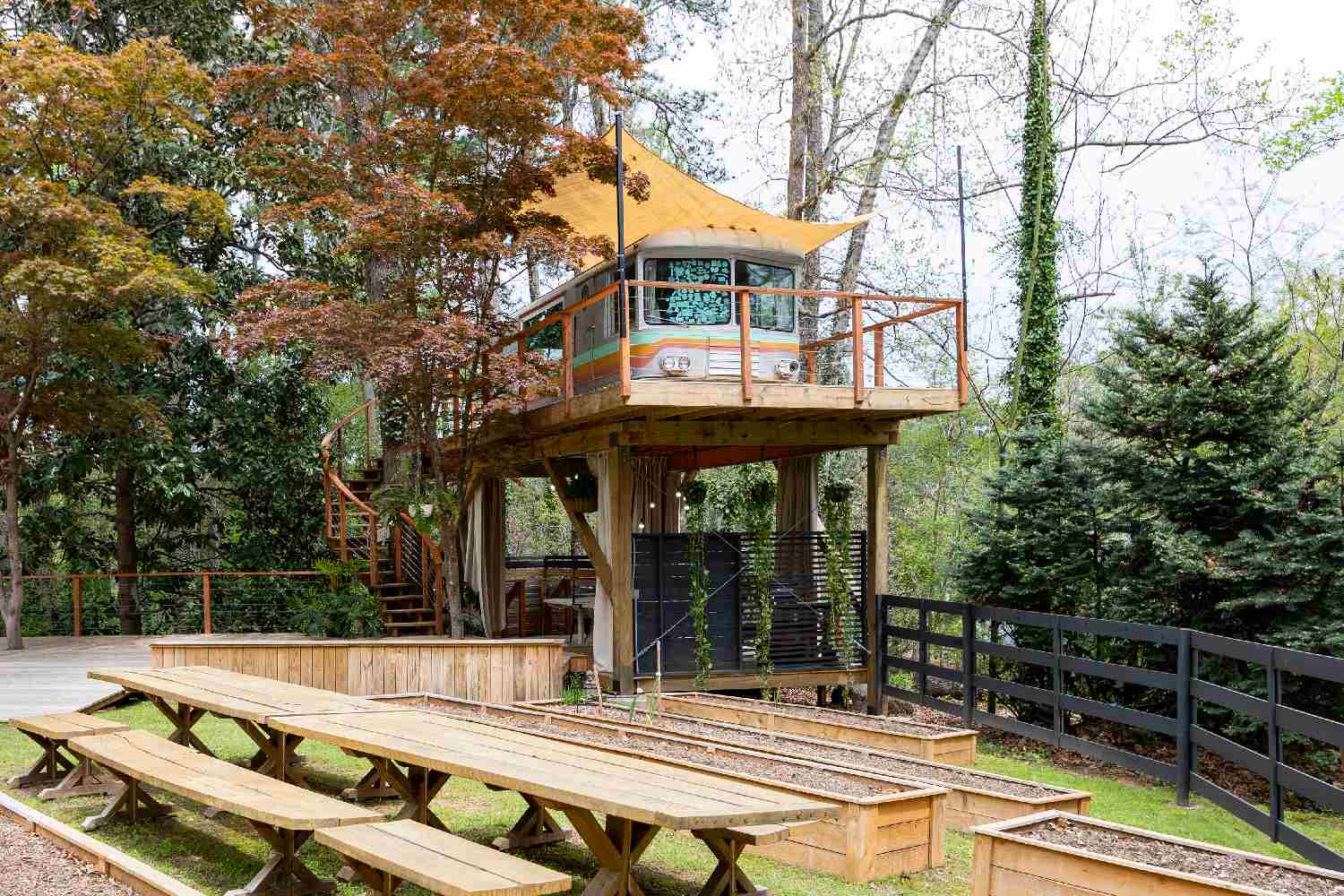 Localizada na Geórgia, EUA, a hospedagem conta com uma casa na árvore feita de kombi, que foi convertida em uma área de convivência super aconchegante. Ela acompanha uma casa principal e funciona como deck de descanso.