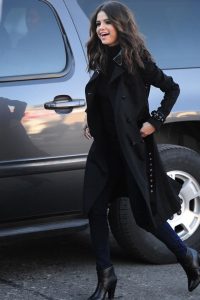 Selena Gomez encantou a todos com um visual totalmente monocromático e extremamente elegante, composto por blazer, calça escura e bota cano curto.